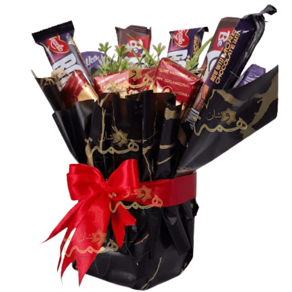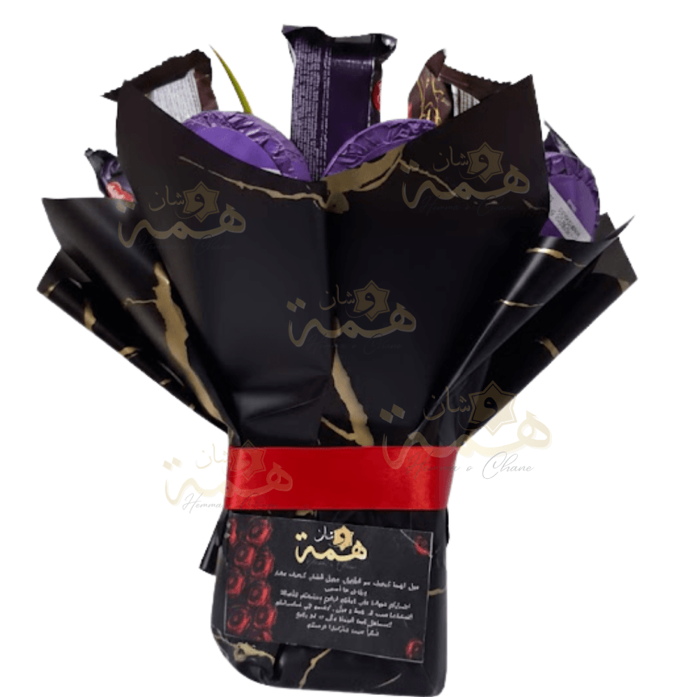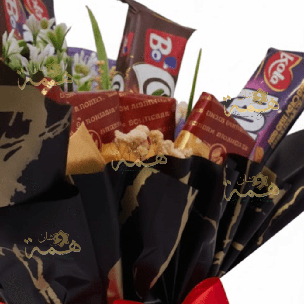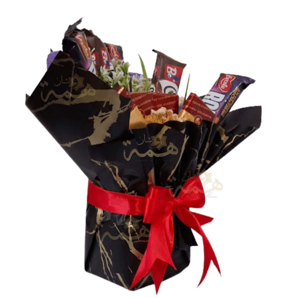 Ce bouquet de chocolats et biscuits Bimo est l’alternative parfaite pour une surprise réussie. Contrairement aux boîtes classiques, il est présenté dans un emballage artisanal (papier kraft de luxe) noir et doré, soigneusement noué avec un ruban rouge élégant.
