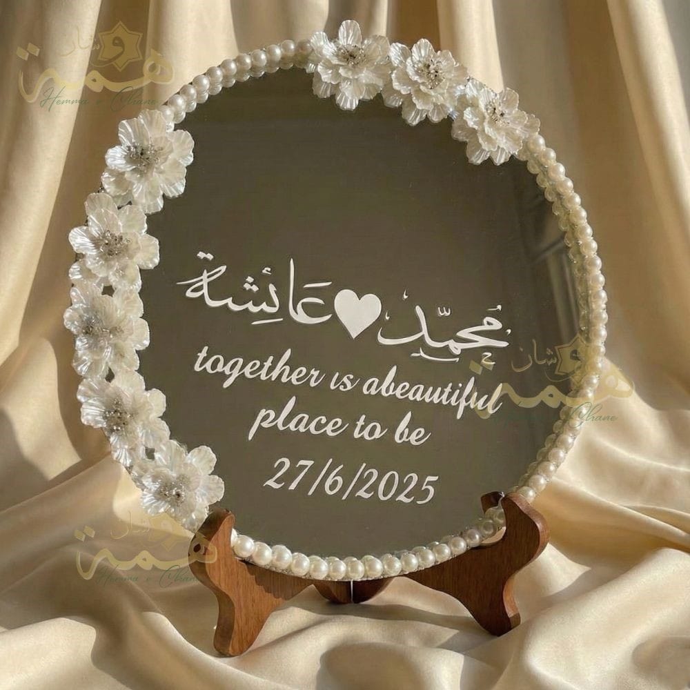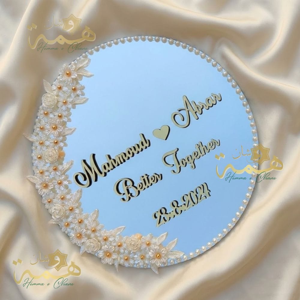 L’Éclat du Luxe pour Votre Jour – Sublimez votre Drib Sdaq, fiançailles ou trousseau avec ce plateau miroir d’exception. Plus qu’un simple accessoire, c’est la pièce maîtresse de votre présentation. Il présente un design haute couture avec un contour raffiné de perles nacrées et de fleurs 3D, est 100% sur mesure (gravure de vos prénoms en Arabe/Français, votre date et votre message personnel), et offre un rendu époustouflant, parfait pour mettre en valeur vos alliances et vos photos. Créez un souvenir éternel et commandez votre modèle unique dès maintenant.