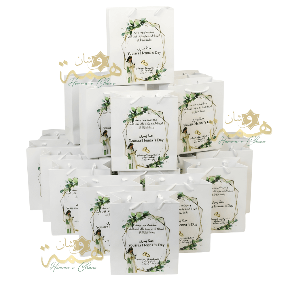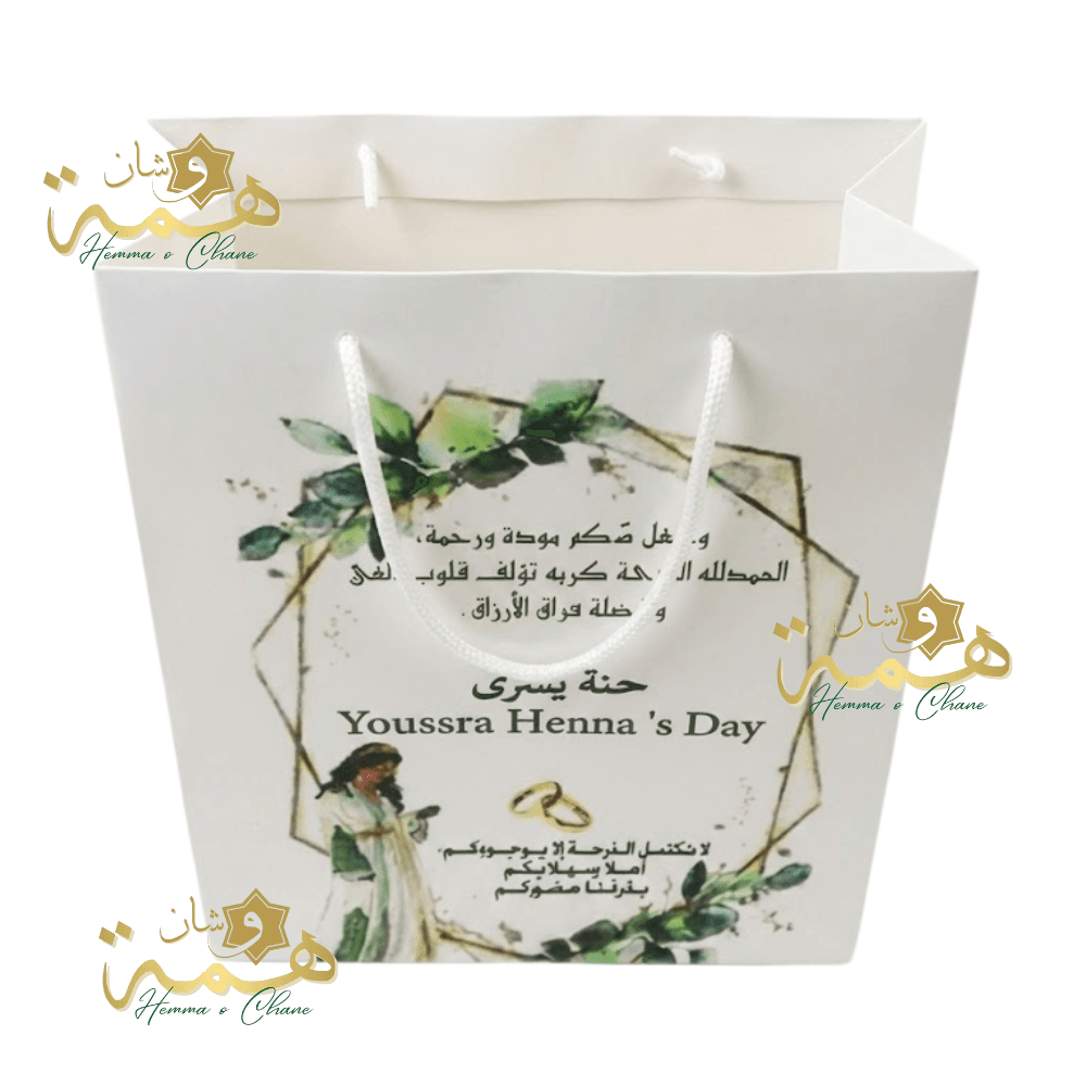Offrez un sac cadeau luxe personnalisé, au format délicat et élégant, parfait pour sublimer vos mariages, hennas et événements exclusifs.